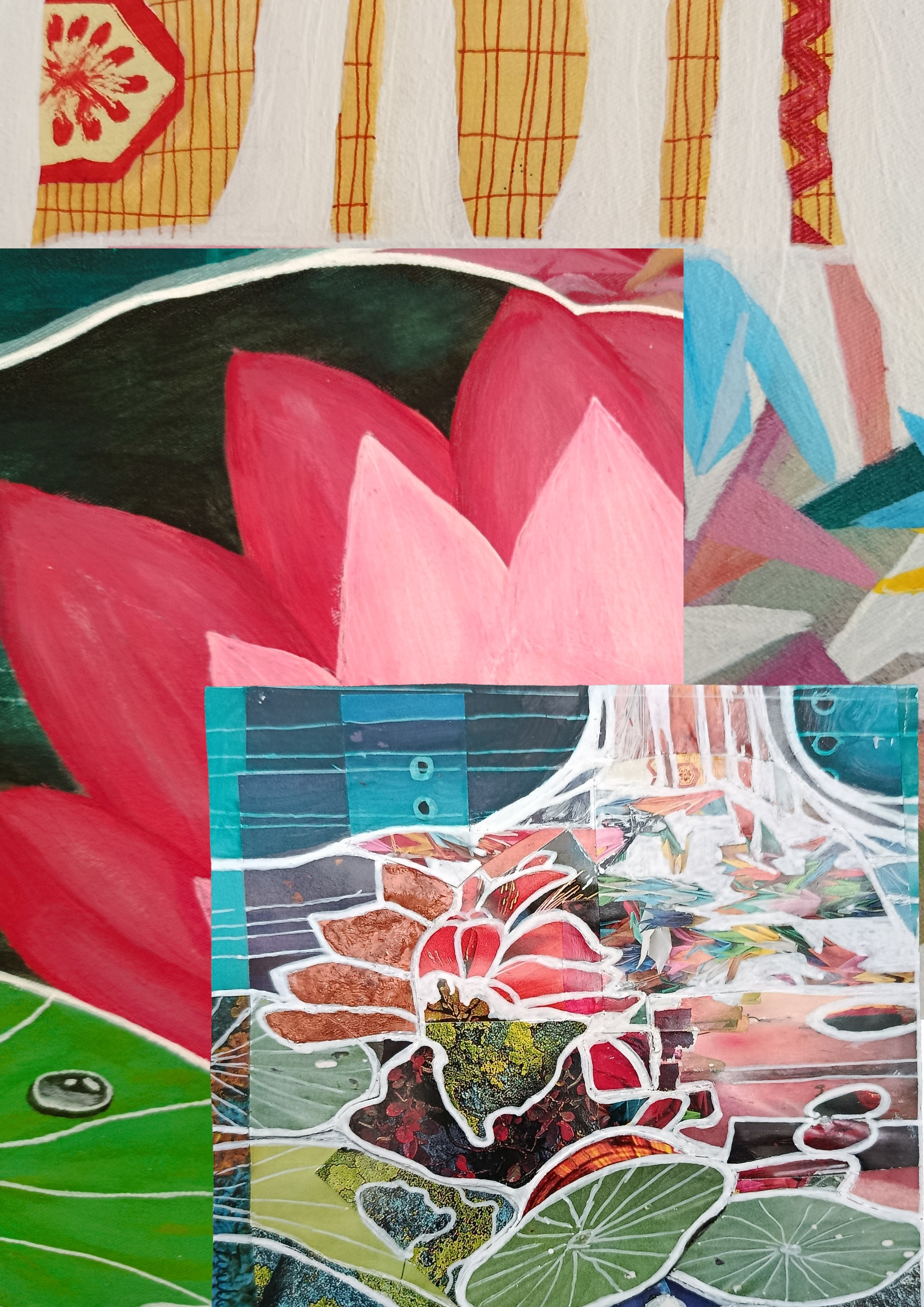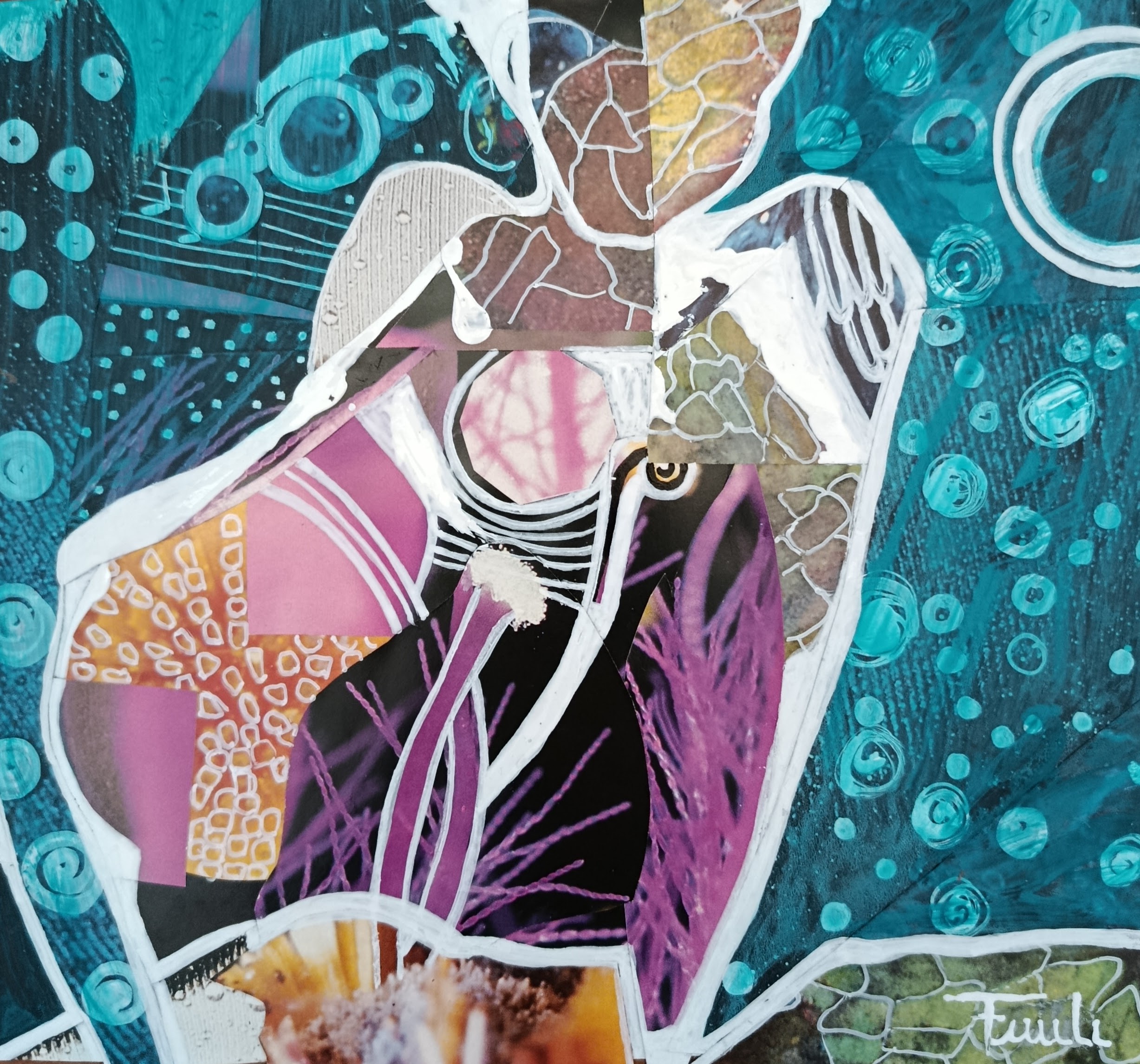 2025 arbeitete ich viel mit Collagen. Diese Bildausschnitte sind für mich Experimentierfeld und Inspiration zugleich. Letztlich ist das Gestalten für mich weniger ein „Tun“ als ein „Zulassen“. Dabei ist mir die Ästhetik wichtig: Die Freude am Schönen und ein Sinn für Harmonie begleiten jeden meiner Schritte – auch dort, wo das Motiv abstrakt oder fragmentarisch wird.