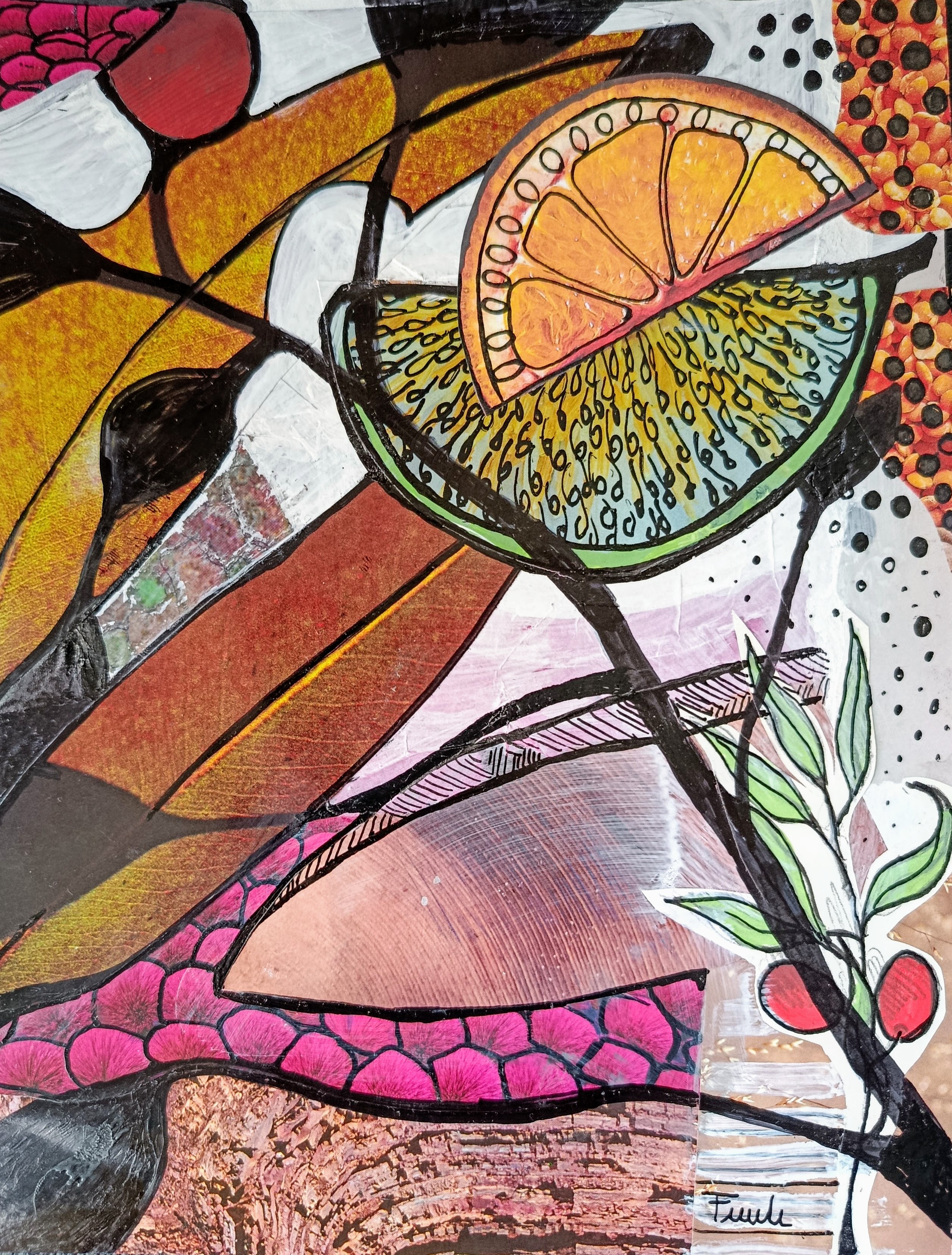 Das Werk „Obstkorb“ hat für mich einen besonderen Stellenwert, weil es der Ausgangspunkt meiner neuen Stilrichtung im Jahr 2025 war. Entstanden ist es ganz spontan im Urlaub, als ich aus Langeweile zu alten Bildbänden und Zeitschriften griff und intuitiv begann, Fragmente zu kombinieren. Aus diesem spielerischen Moment entwickelte sich eine Komposition, die mich selbst überraschte.