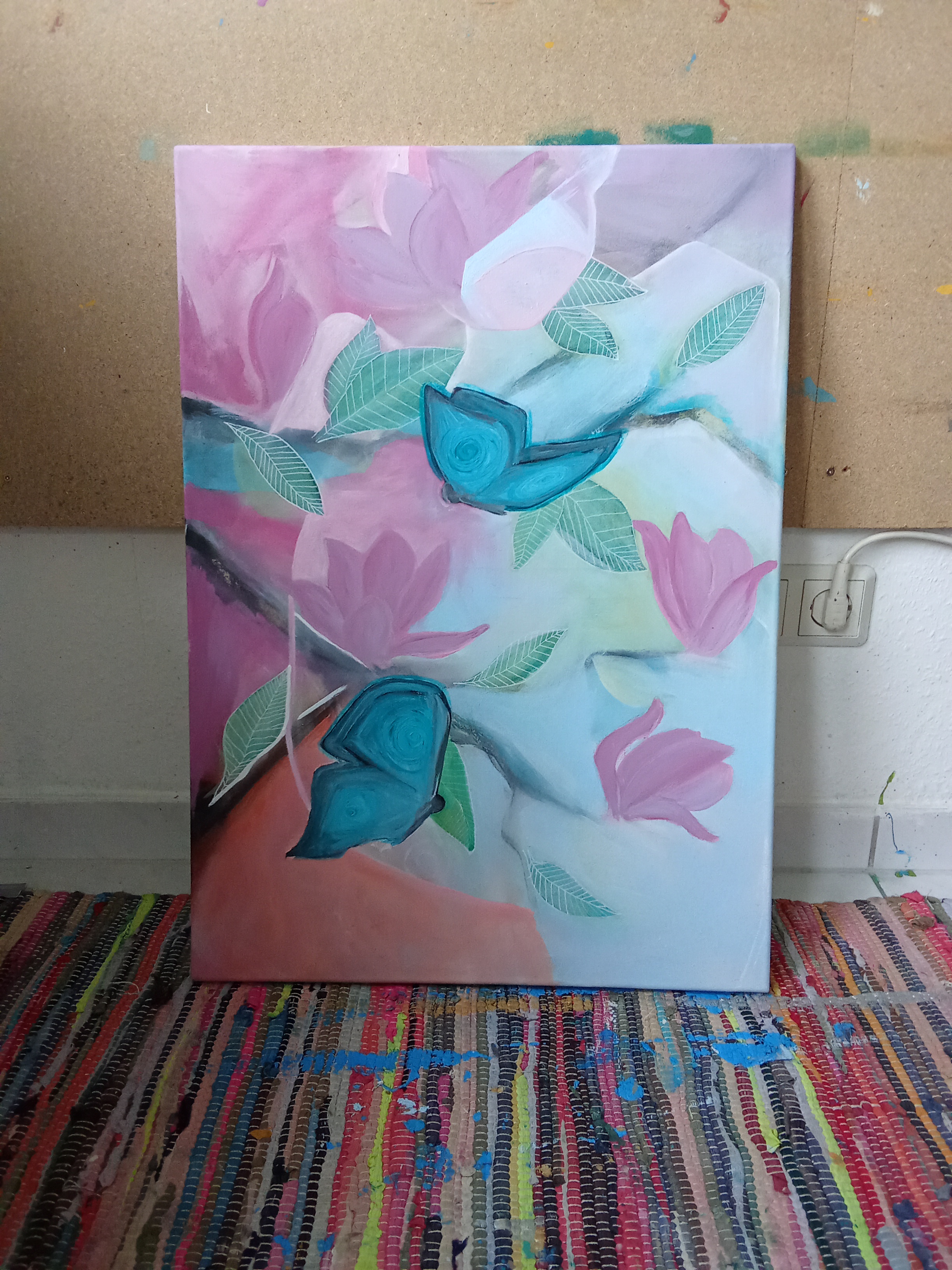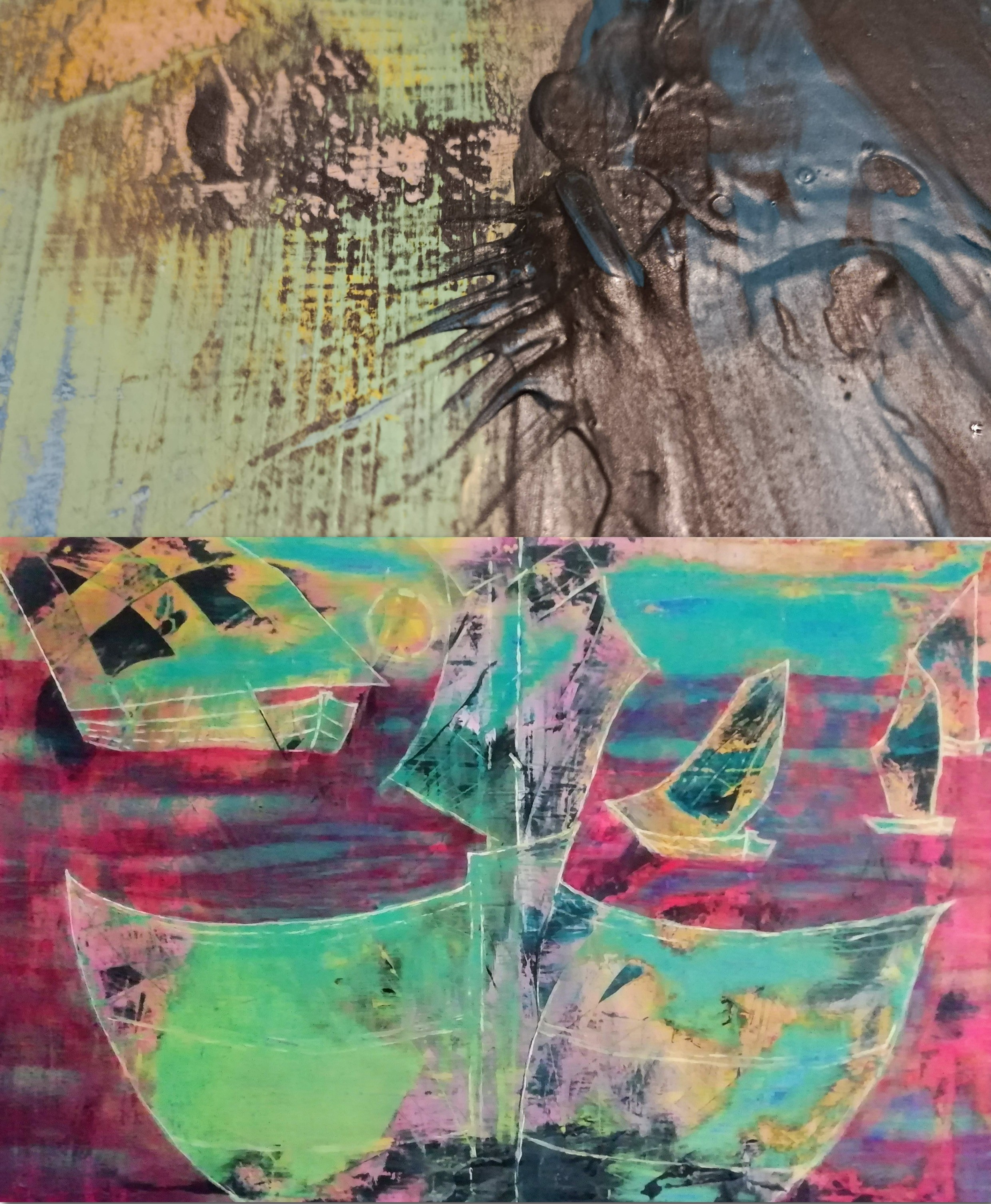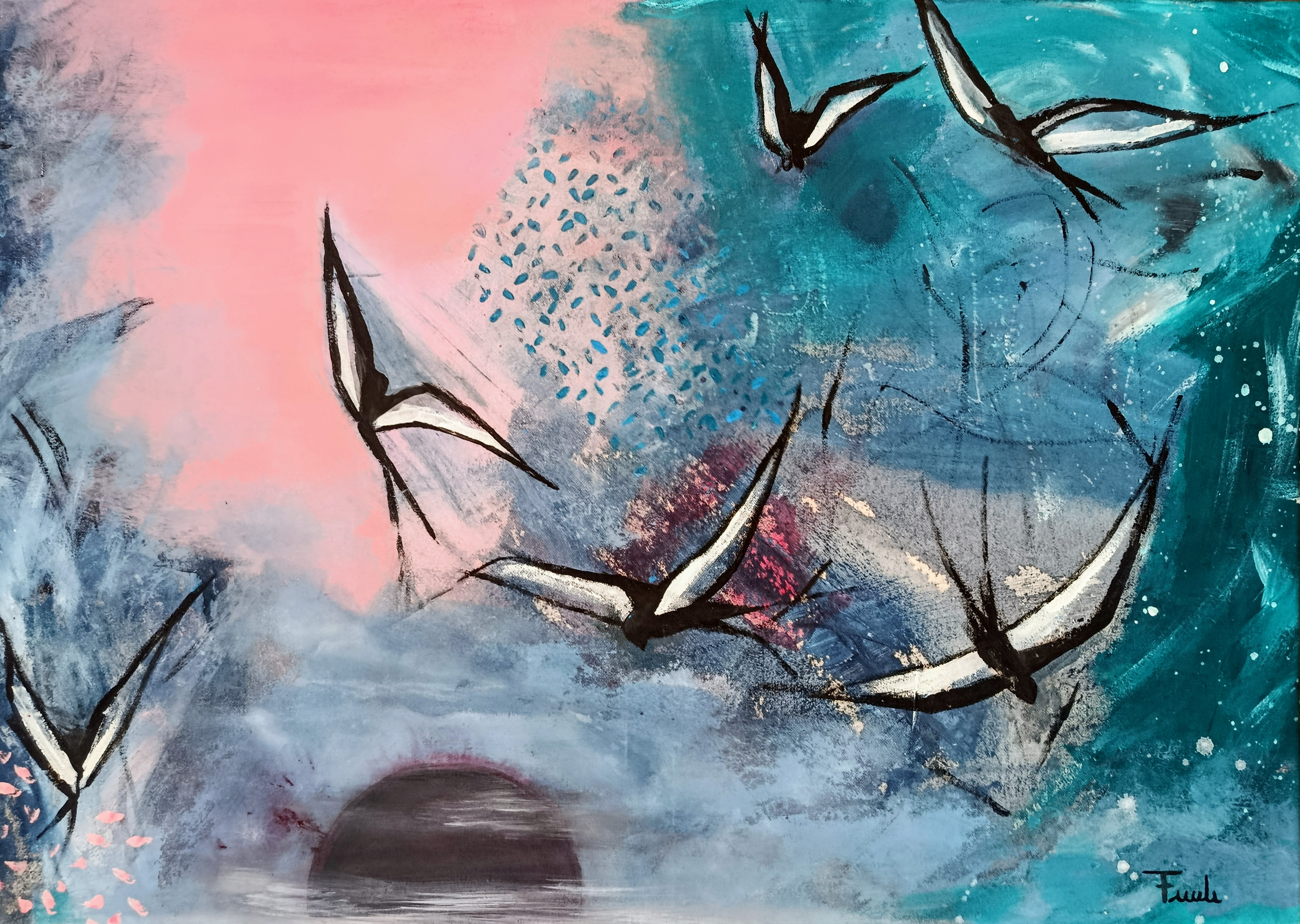 Dieses Werk war mein erstes bewusst intuitives Bild und entstand über mehrere Monate hinweg. Ursprünglich begann es als maritime Landschaft (siehe unten), doch im Prozess löste ich mich immer mehr von der ursprünglichen Idee. Durch wiederholtes Abwaschen, Übermalen und erneutes Auftragen von Farbschichten entwickelte sich das Bild Schritt für Schritt in eine völlig neue Richtung. Der Prozess war ein ständiges Wechselspiel aus Loslassen und Wiederfinden: Jede Schicht brachte etwas Altes zum Verschwinden und etwas Neues zum Vorschein. Ohne festen Plan, nur geführt von Farbe, Bewegung und Gefühl, entstand schließlich ein Bild, das nicht mehr an seine Ausgangsform erinnert – sondern an den Moment, in dem ich zum ersten Mal wirklich intuitiv gemalt habe.