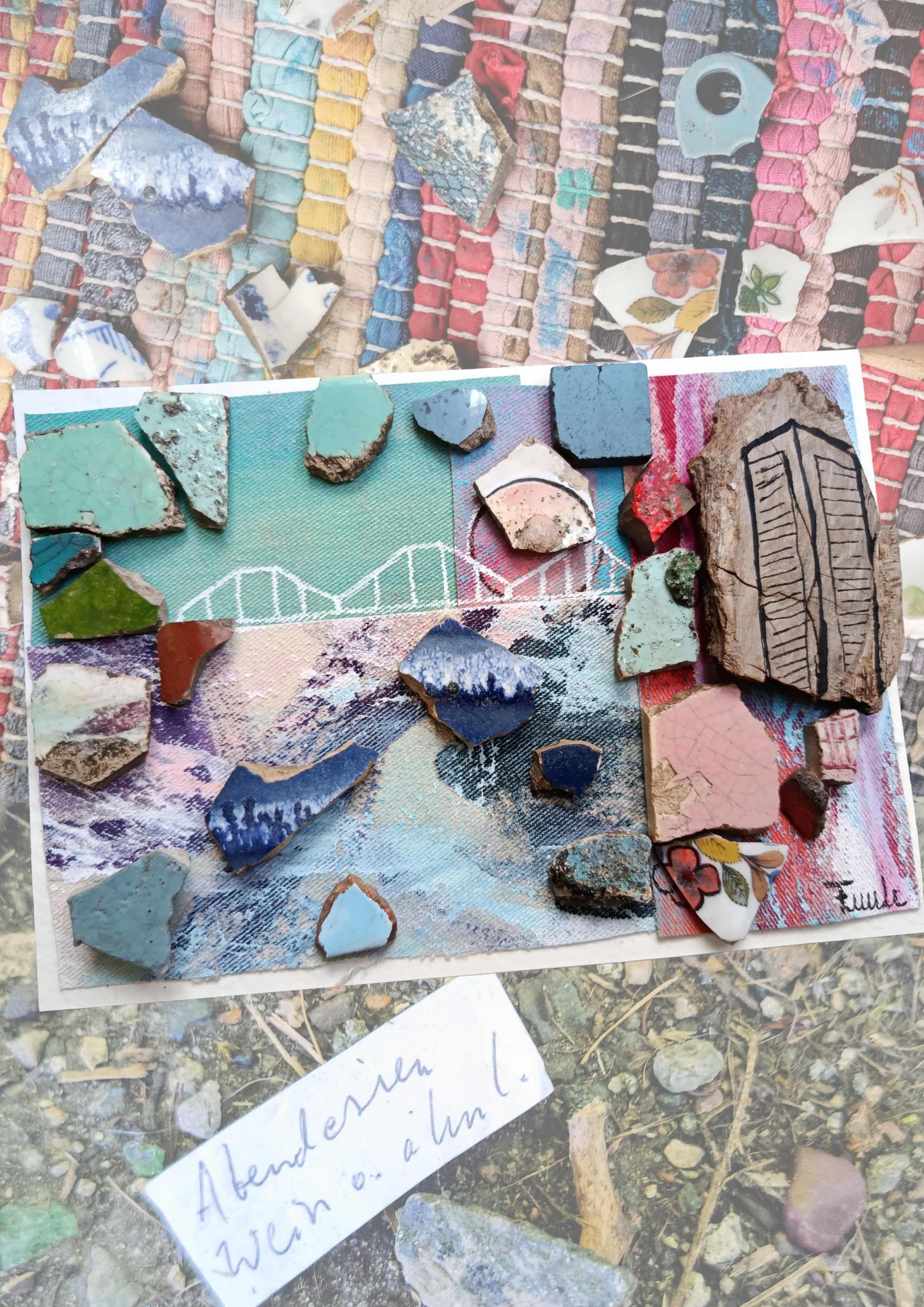 Oft bin ich im Waldpark unterwegs. Eigentlich nur zum Laufen, aber meine innere Elster gewinnt immer. Wer die Wege dort kennt, weiß, dass man da buchstäblich auf Scherben läuft – alter Schutt, der da irgendwann mal zur Befestigung gelandet ist. Anstatt nur drüberzustolpern, hab ich angefangen, die Stücke einzusammeln. Und beim Legen dieser Collage kam mir der Gedanke: Eigentlich ist das Leben ja genau das. Wir alle sammeln Scherben. Brüche, Kanten, Dinge, die mal ganz waren und jetzt eben nicht mehr. Am Ende ist das Ganze oft viel interessanter als das, was vorher „perfekt“ war. Das hier ist mein ganz persönliches Stück Waldpark-Boden (Postkartengröße), neu sortiert.