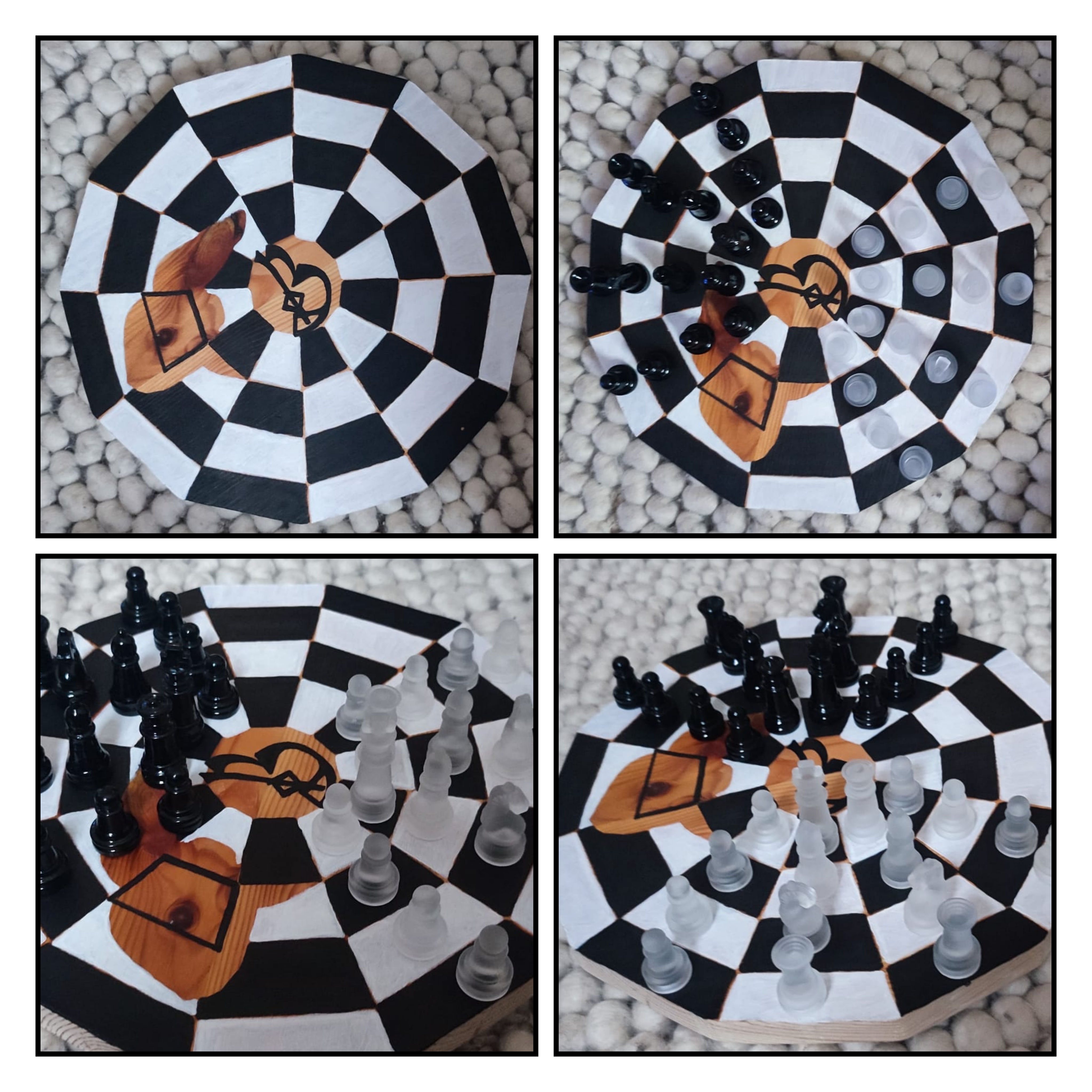 Dieses handgefertigte Rundschach bricht mit der klassischen Geometrie. Durch die kreisförmige Anordnung der Felder entstehen völlig neue Zuglinien und taktische Möglichkeiten. Die natürliche Maserung des Holzes wurde so in die Komposition einbezogen, dass ein Astloch zum lebendigen Auge eines Hasenkopfes wird. Es ist dieses Zusammenspiel aus bewusster Gestaltung und dem, was die Natur vorgibt, das meine Arbeiten ausmacht.